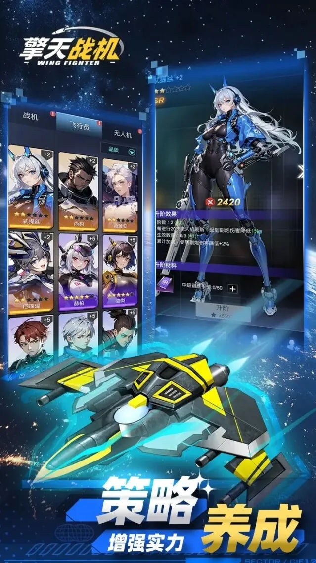 1、许多不同的设计以及性能的战斗机可以选择,根据喜好可以不断解锁更多的战斗机进行成功获取更多资源奖励;
