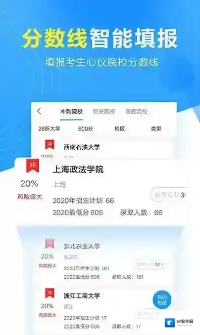 根据考生分数以及个人情况,智能匹配高校 ,全面推荐冲刺院校、适中院校、保底院校;
