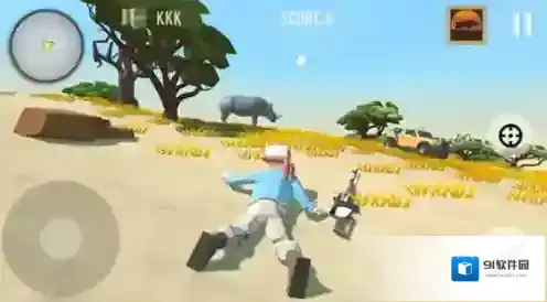 3、躲“犀牛”!被撞倒地,点左侧移动,绕树跑,3秒摆脱,每猎10只,领新枪(狙击+5),分数翻倍。
