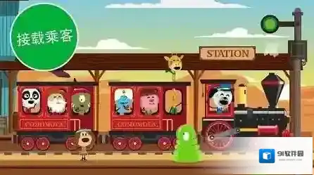 2、进入火车站场景,根据“接载乘客”的提示,让火车停靠在站台边,搭载不同的动物乘客如熊猫、圣诞老人、长颈鹿等上车,完成乘客接载任务。
