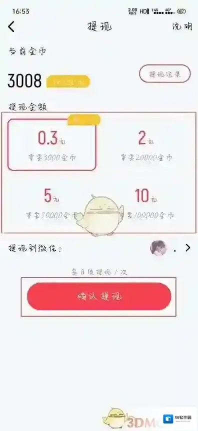 3、在提现之前,需要获得满足提现要求的金币/金额,第一次提现的用户只需要满0.3元(3000金币),之后提现需要满1元(10000金币);