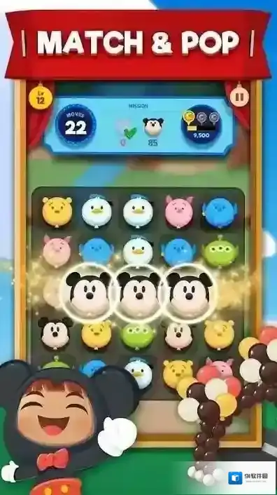 2、随着关卡推进,挑战不同难度的消除任务,利用迪士尼明星气球的连环爆特效和套装技能,在规定时间内完成更高分数目标,解锁更多星星与道具。
