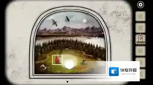 1、视角向右点击妹妹,把黄白两块石头调整位置让四个庄子全部震裂,之后我们进入森林中在树上拿到围巾。